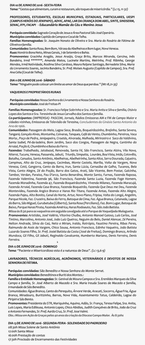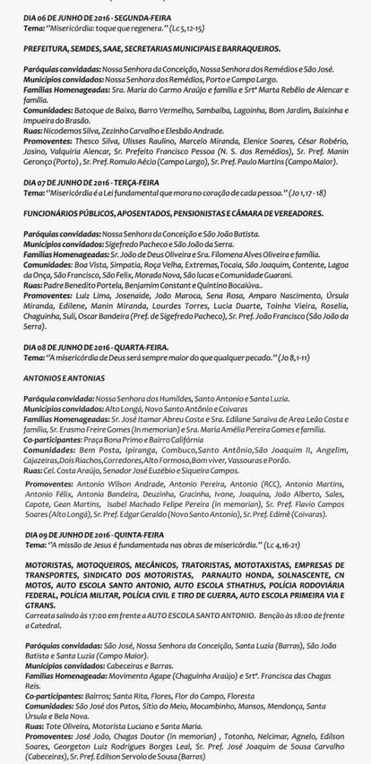 A Paróquia de Santo Santo Antônio divulgou nesta quarta (18), a programação oficial das Trezenas em comemoração ao Padroeiro da cidade de Campo Maior.