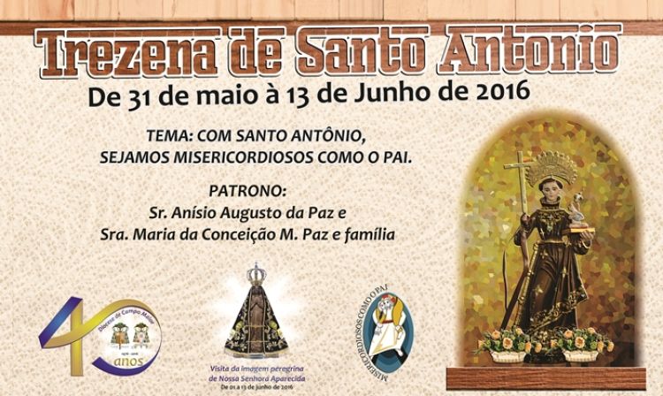 Com o tema “Com Santo Antonio, sejamos misericordiosos como o Pai”, o festejo está em sintonia com o pedido do Papa Francisco para celebrarmos o Ano Extraordinário da Misecórdia, os patronos da festa serão: Anísio Augusto da Paz e Maria da Conceição M. Paz e família.