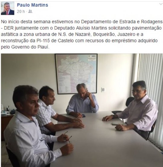 O Prefeito de Campo Maior, Paulo Martins como uma liderança estadual e pensando na melhoria da região dos carnaubais esteve na última segunda-feira (16) no Departamento de Estrada e Rodagens (DER) discuntindo com o diretor Zé Dias sobre a inclusão da reconstrução da rodovia PI-115 no emprestimo feito pelo Estado junto ao Banco Internacional para Reconstrução e Desenvolvimento (BIRD), instituição financeira do Banco Mundial.