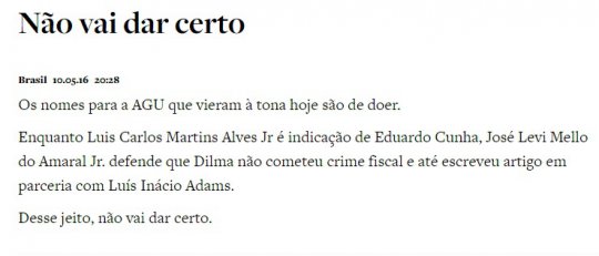 No dia 10 de maio, antes da escolha do chefe da AGU, o site o Antanogista publicou nota intitulada: “Não vai dar certo”, onde afirmou que o procurador da Fazenda Nacional Luís Carlos era indicação de Cunha.