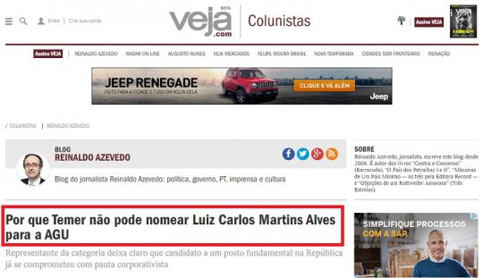 Outra crítica à possibilidade do campomaiorense assumir a Advocacia Geral partiu do colunista da Veja Reinaldo Azevedo. No mesmo dia 10 de maio, Azevedo publicou nota em seu blog no site da revista com título: “Por que Temer não pode nomear Luiz Carlos Martins Alves para a AGU”.