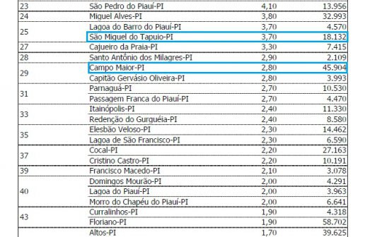 São Miguel do Tapuio é a melhor posicionada na região dos carnaubais. A cidade de 18 mil habitantes ocupa a 25ª posição entre os 224 municípios do Piauí. Na escala de 0 a 10, São Miguel obteve nota 3,70. Quatro posições depois aparece Campo Maior. O município de 45 mil habitantes alcançou nota 2,80.
