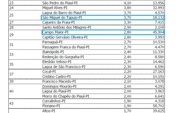 O ranking do Ministério Público Federal aponta ainda que 10 municípios da região receberam nota zero na avaliação. São eles: Boa Hora, Boqueirão do Piauí, Cabeceiras, Cocal de Telha, Coivaras, Juazeiro do Piauí, Nossa Senhora de Nazaré, Novo Santo Antônio, São João da Serra e Sigefredo Pacheco.