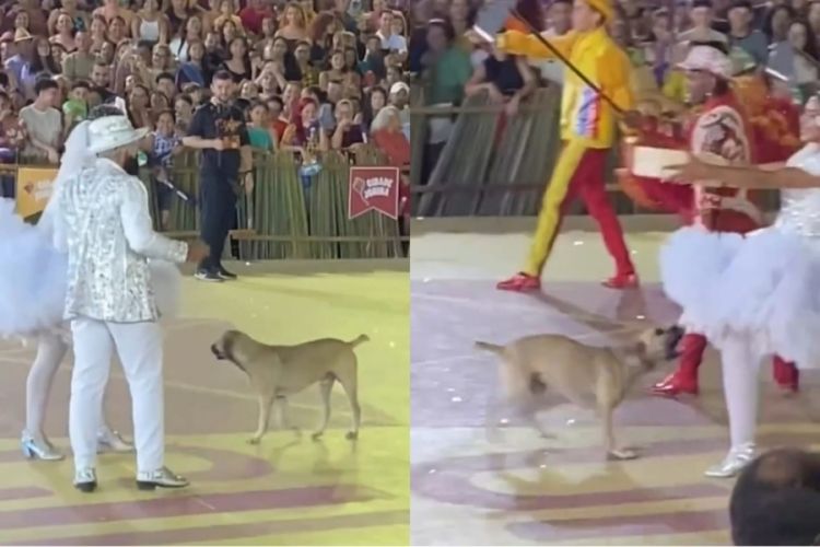 Em vídeo gravado pela plateia, o cachorro passeia pelo palco e distrai até os quadrilheiros, que mantêm a compostura e continuam a coreografia. Um bombeiro civil tenta retirar o animal, que morde uma sacola e logo retorna com uma calça do figurino na boca.