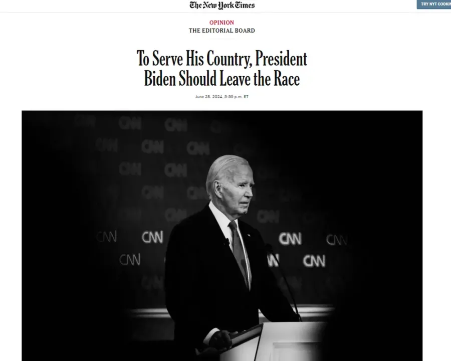 "O Sr. Biden foi um presidente admirável. Sob sua liderança, a nação prosperou e começou a enfrentar uma série de desafios de longo prazo, e as feridas abertas pelo Sr. Trump começaram a cicatrizar. Mas o maior serviço público que o Sr. Biden pode agora prestar é anunciar que não continuará a concorrer à reeleição.”, afirmou o Conselho editorial do The New York Times.