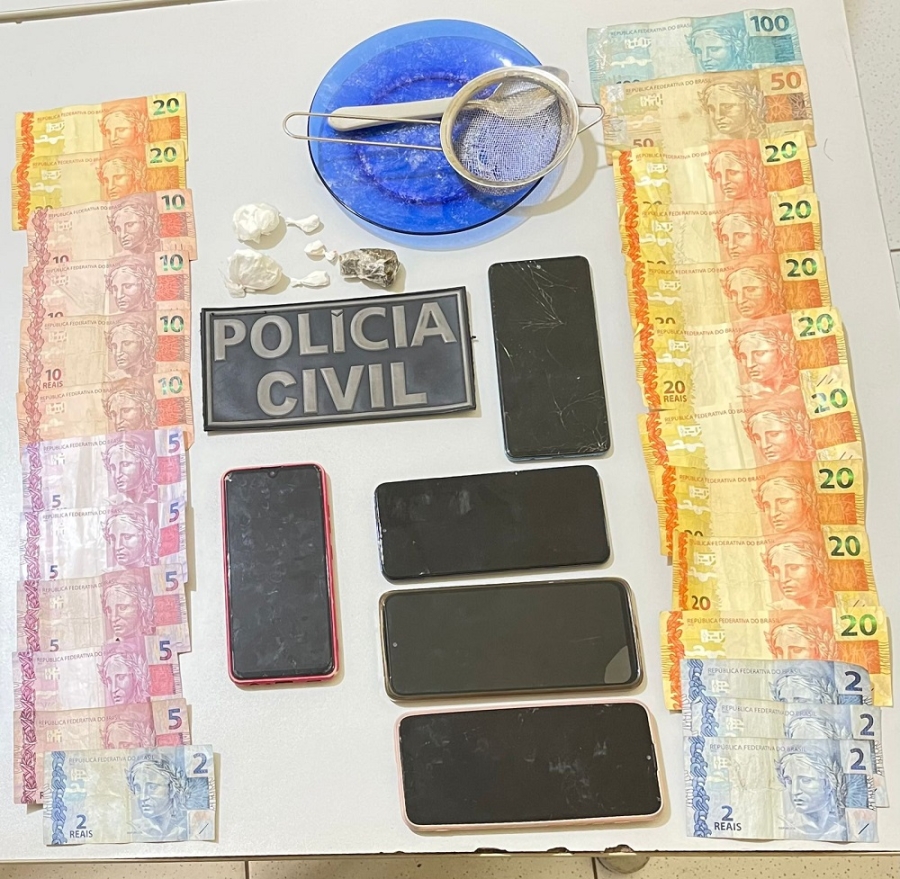 Durante buscas, na casa do suspeito foram encontrados cinco invólucros contendo cocaína e um invólucro contendo maconha, além de cinco celulares, material para dolagem e dinheiro em cédulas trocadas.