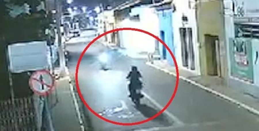 As imagens mostram a condutora, ainda não identificada, trafegando na contramão pela Rua Coronel José Fortes e colidindo frontalmente com outra moto, que era conduzida por outra mulher.