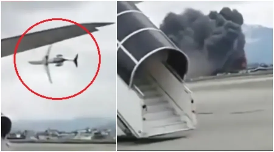 Imagens mostram bombeiros tentando apagar o incêndio e uma espessa fumaça preta no local do acidente. Um vídeo também registrou o avião voando um pouco acima da pista e inclinando-se excessivamente para a direita antes de cair.