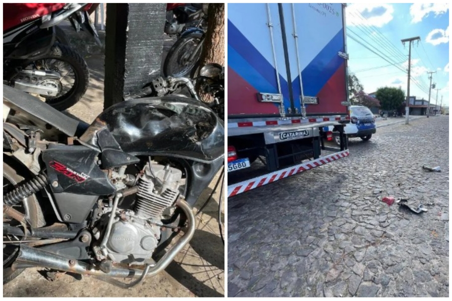 Após a colisão, a moto e o condutor foram parar debaixo do caminhão. Uma das rodas do caminhão passou por cima da moto, causando danos significativos ao veículo.