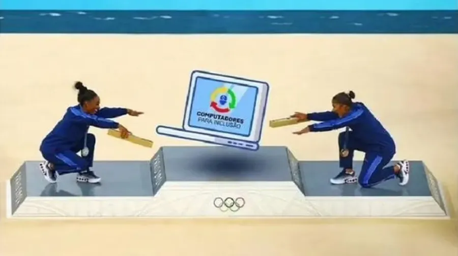 Na publicação, divulgada poucas horas após a vitória de Rebeca, na segunda-feira (5), a imagem original da brasileira sendo homenageada por Simone Biles e Jordan Chiles – medalhas de prata e bronze, respectivamente –, foi substituída pela imagem de um computador que faz referência ao programa Computadores para Inclusão, do governo federal.