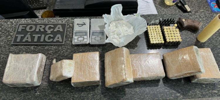 A droga apreendida foi contabilizada em 105 gramas de cocaína, 1.850 gramas de maconha, aproximadamente 500 gramas de crack, duas balanças de precisão, 30 munições de .40 e 40 unidades de munição de 9mm.