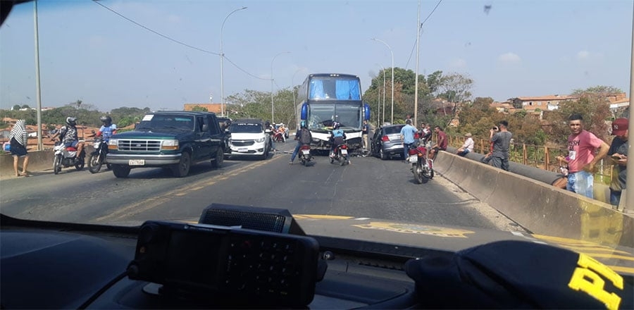 Uma colisão envolvendo um ônibus e mais três veículos por volta das 8h40, desta terça-feira (27) sobre a ponte Presidente Médici, conhecida como ponte do Tancredo Neves, deixou o trânsito congestionado no local e a ponte parcialmente interditada. O trânsito está parado dos dois lados da BR-343.