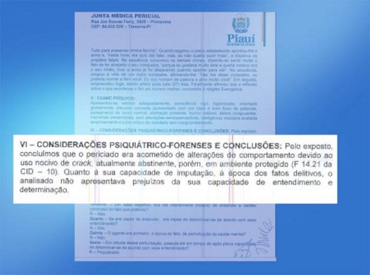"Concluímos que o periciado era acometido de alterações de comportamento devido ao uso nocivo de crack....Quanto à sua capacidade de imputação, à época dos fatos delitivos, o analisado não apresentava prejuízos da sua capacidade de entendimento e determinação", concluíram os psiquiatras.