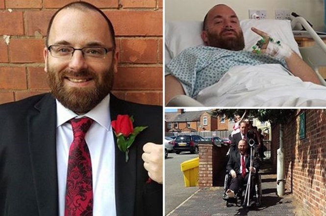 Posteriormente, ele se casou sua amada noiva, Sam, mas devido ao problema no pé, o homem usou muletas e uma cadeira de rodas durante a comemoração.