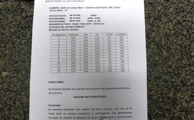 Antes da atual gestão assumir apenas alguns poços recebiam tratamento na água que abastece Campo Maior. No final do ano passado o EM Foco abordou o assunto mostrando relatórios que comprovam que até 2010, cerca de 80% da água era distribuida sem tratamento (REVEJA). Hoje, 100% do sistema tem tratamento de água. No entanto a oposição ao Prefeito Paulo Martins e que quando administrou a cidade não tratava a água fez uma denuncia usando um laudo de um laboratório de Teresina. O SAAE contesta e questiona a credibilidade da análise. Em nota o órgão explica a situação, veja: