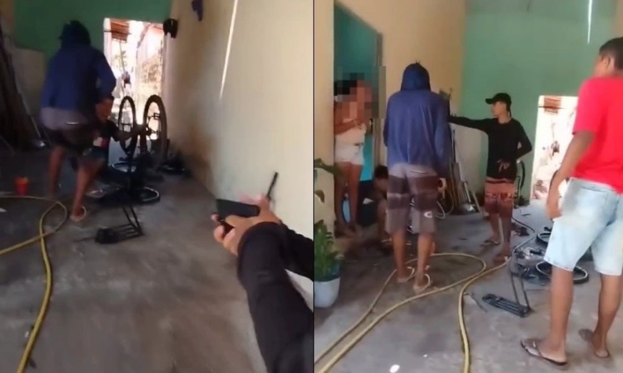 O vídeo (acima) mostra o momento em que quatro jovens armados com pistolas e facas invadem a casa. Estão no lugar o adolescente, um homem, uma mulher e uma criança.