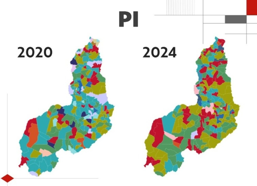 No Piauí, em relação a 2020, o Partido dos Trabalhadores mais que dobrou o total de cidades que ficarão sob sua gestão e o Progressistas, que teve 84 vitórias em 2024, caiu para menos da metade.