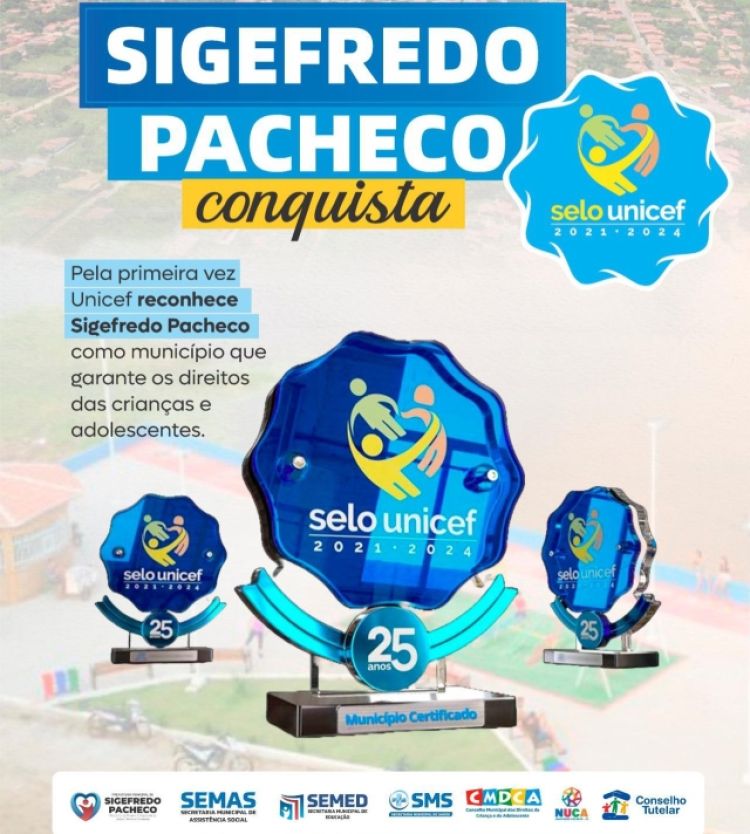 Pela primeira vez o município de Sigefredo Pacheco conquistou o SELO UNICEF da edição 2021-2024. O prefeito Murilo Bandeira que está em Brasília comemorou a conquista e parabenizou todos os envolvidos.