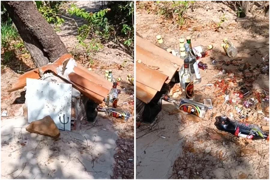 De acordo com as imagens feitas no dia 12 de outubro de 2024, o “despacho”, como é conhecido popularmente, incluía bebidas alcoólicas, bombons, brinquedos e uma casa pequena com dois cifres de bode no telhado.