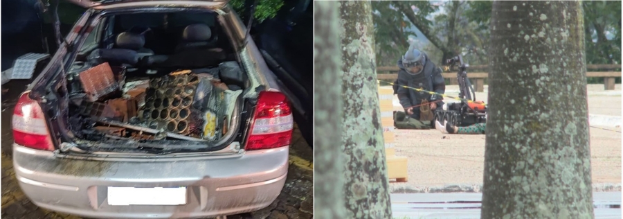 No porta-malas do veículo do homem foram encontrados materiais parecidos com explosivos e tijolos, além de outros objetos. Também foram registradas imagens com fogo e fumaça no veículo. Parte das explosões no carro se parecia com fogos de artifício.