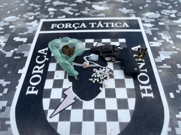 Em diligências em uma residência localizada na Rua São Francisco, onde residia o indivíduo, a equipe de polícia encontrou aproximadamente 50 gramas de maconha, 15 gramas de crack, 10 gramas de cocaína, além de um revólver calibre 38 com numeração suprimida.
