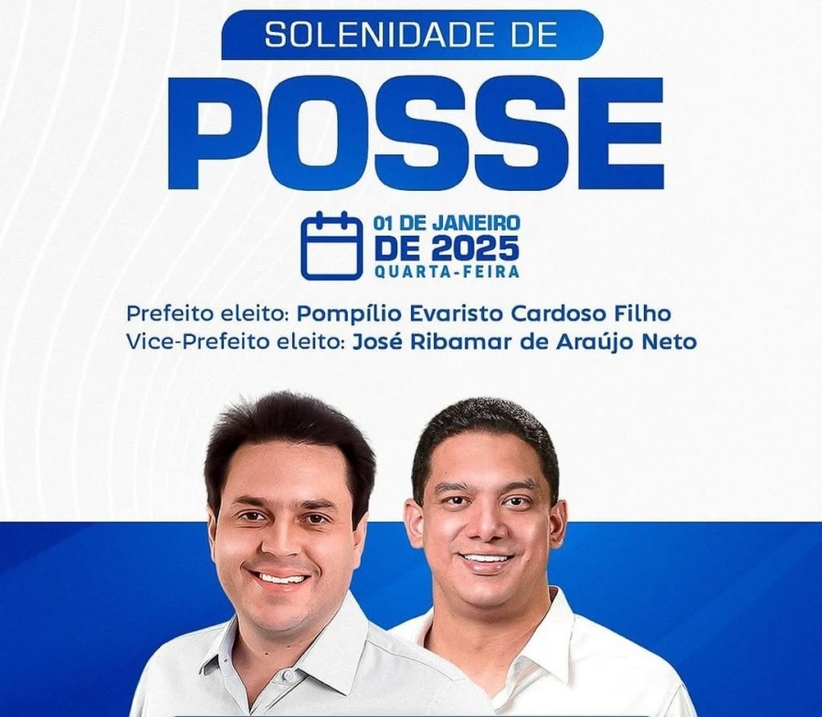 Na próxima quarta-feira, dia 01 de janeiro de 2025, será realizada na cidade de São Miguel do Tapuio, a cerimônia de posse do prefeito reeleito Pompílio Evaristo, bem como dos demais candidatos diplomados e eleitos nas eleições municipais do ano de 2024.