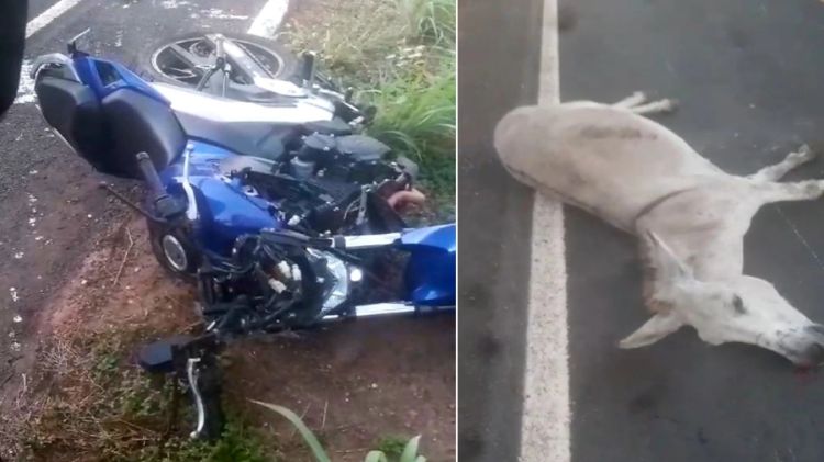 O animal morreu no local após receber uma forte pancada. A moto ficou com a parte da frente bastante danificada.