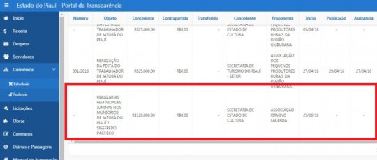 Conta, porém, no Portal da Transparência, do próprio governo do Piauí, a publicação de um convênio (sem numeração) destinando R$ 120.000,00 (cento e vinte mil reais), através da Secretaria de Estado de Cultura, para o objeto "realização de atividades juninas nos municípios de Jatobá do Piauí e Sigefredo Pacheco". O início do convenio é datado de 25/06/2016. O proponente, ou seja, quem vai receber o montante, é a Associação Firmino Lacerda.