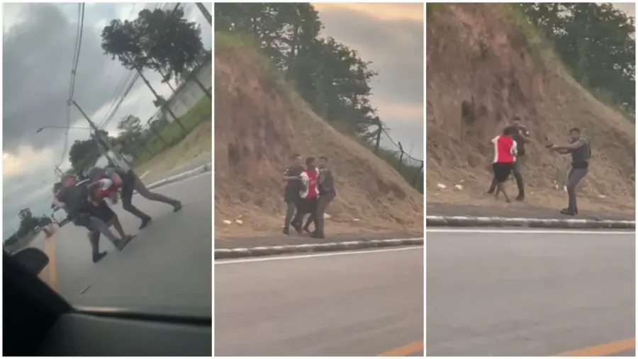 A agressão continuou na calçada, próximo a um morro, onde os policiais tentaram conter o rapaz puxando-o pelos braços.