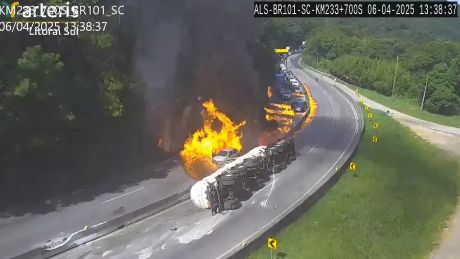Uma carreta tombou, pegou fogo e deixou a BR-101 totalmente interditada no km 233, em Palhoça, na Grande Florianópolis, informou a Polícia Rodoviária Federal (PRF). O acidente ocorreu às 13h37 deste domingo (6) e só nesta segunda-feira a via foi liberada.