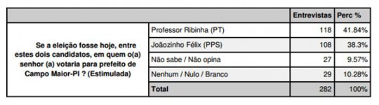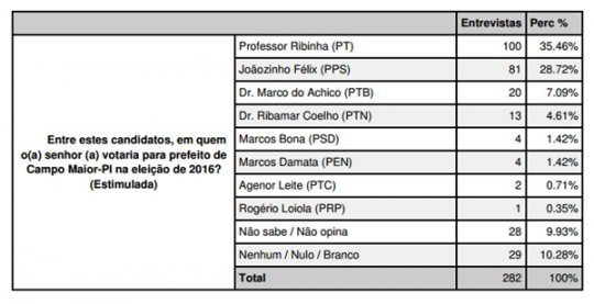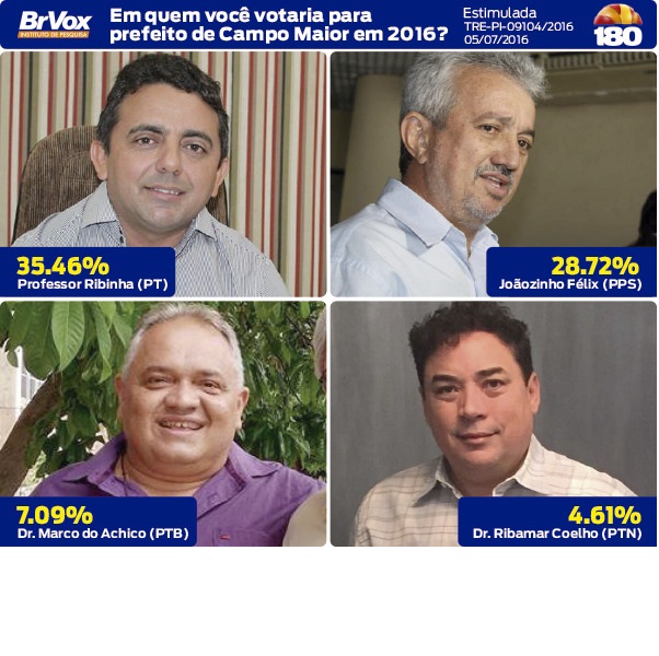 Uma pesquisa divulgada nesta segunda (11) mostra os números de intenção de votos para os pré-candidatos a prefeito de Campo Maior. No levantamento realizado pelo Instituto BrVox, Professor Ribinha (PT) liderada a corrida eleitoral seguido por Joãozinho Felix (PPS). Outros seis pré-candidatos também foram citados por eleitores.