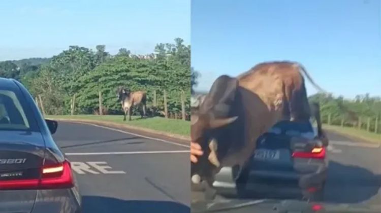 Um touro solto em uma avenida avançou sobre um homem e pulou sobre uma BMW na manhã desta sexta-feira (11) na zona sul de Ribeirão Preto (SP). Uma motorista registrou o incidente.