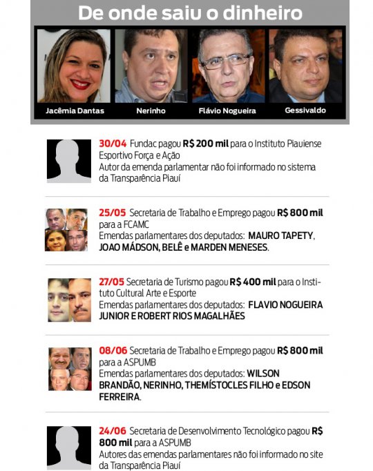 O dinheiro saiu da Fundação Cultural do Piauí (antes com indicação do deputado Francis Lopes), agora Secretaria de Cultura (deputado Fábio Novo), Secretaria e Turismo (Flávio Nogueira, pai do deputado Flávio Nogueira Júnior), da Secretaria de Trabalho e Emprego (deputado Gessivaldo Isaías) e Secretaria de Desenvolvimento Tecnológico (deputado Nerinho).