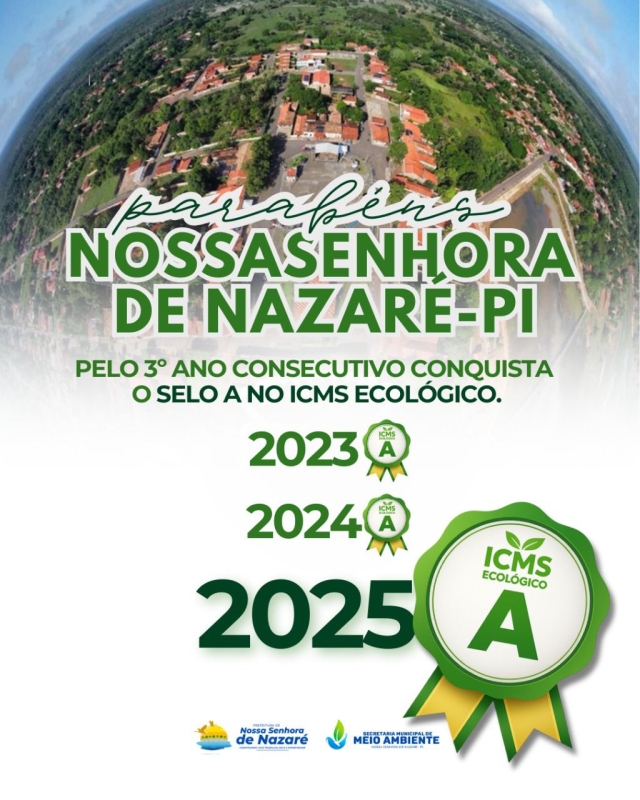 A cidade de Nossa Senhora de Nazaré conquista pela terceira vez consecutiva o Selo A no ICMS Ecológico. Esse reconhecimento é resultado do compromisso da gestão com o meio ambiente e com a qualidade de vida da população.