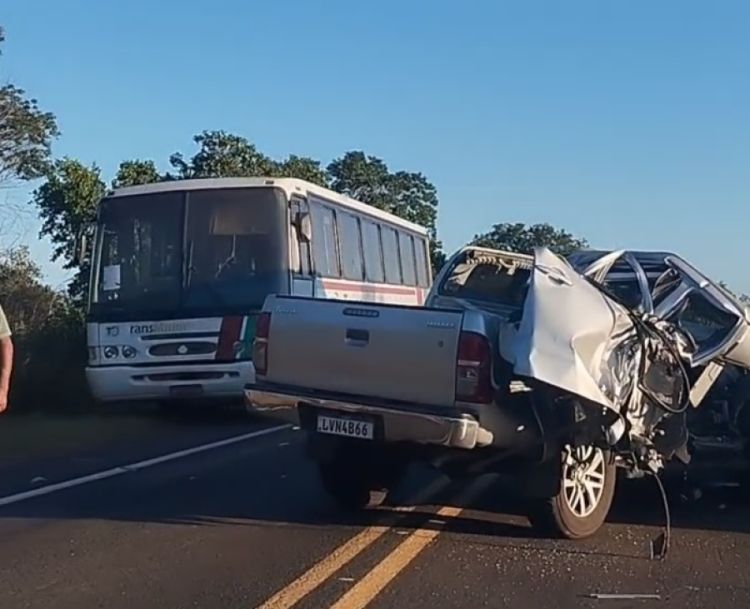 Segundo informações preliminares, uma caminhonete modelo Toyota Hilux, colidiu violentamente na traseira de um ônibus que estava quebrado e estacionado às margens da rodovia.