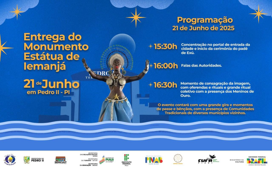 A cidade de Pedro II inaugura, no próximo sábado (21), o monumento com a escultura de Iemanjá, instalado na entrada do município, às margens do Açude Joana. Com apoio do Governo do Piauí, a solenidade será realizada a partir das 15h e integra a programação oficial do Festival de Inverno, um dos maiores eventos culturais do estado, que atrai turistas de diversas regiões do país.