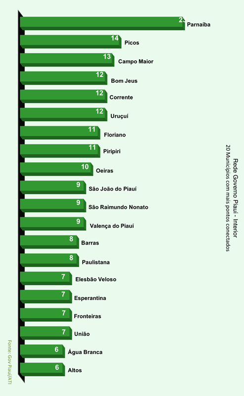 Segundo Amaral, os 20 municípios com mais pontos conectados foram ranqueados com base na presença de órgãos do governo nessas cidades. “Não consideramos Teresina, então de acordo com o levantamento nós temos os três primeiros colocados onde aparece em primeiro lugar Parnaíba com 23 pontos de internet, Picos com 14 e Campo Maior com 13”, revela.