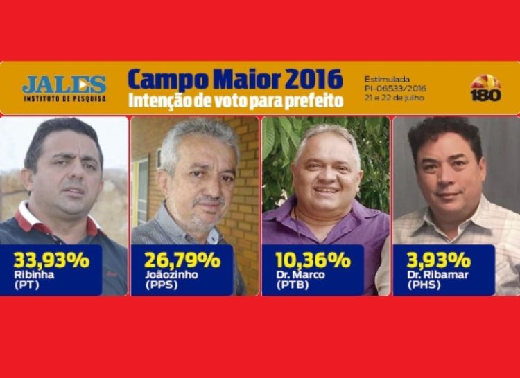 A pesquisa Jales em Campo Maior est? registrada no Tribunal Superior Eleitoral sob o n?mero PI-06533/2016. Foi realizada nos dias 21 e 22 de julho ouvindo 280 eleitores maiores de 16 anos. A margem de erro ? de 5,84% e o n?vel de confian?a de 95%.