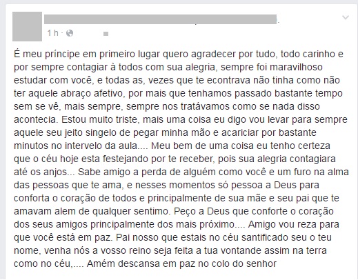 Nas redes sociais, amigos lamentaram a morte do estudante. “É meu príncipe em primeiro lugar quero agradecer por tudo, todo carinho e por sempre contagiar a todos com sua alegria. Sempre foi maravilhoso estudar com você”, escreveu uma amiga de sala.