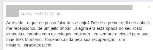 Israel é lembrado pela forma carinhosa e gentil que tratava os amigos. “Desde o primeiro dia de aula já me recepcionou de um jeito ímpar. Alegria era estampada no seu rosto, simpatia e carinho com os colegas”, disse outra amiga.