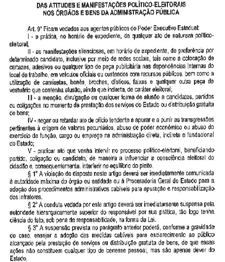 A edição do dia 20 de julho, do Diário Oficial do Estado do Piauí, trousse a publicação do Decreto 16681 assinado pelo governador do Piauí, Wellington Dias (PT) que faz uma série de restrições aos servidores estaduais com relação às eleições de outubro próximo.