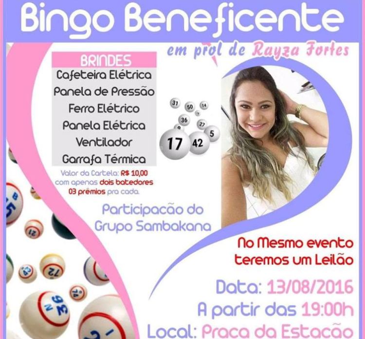 Será realizado no dia 13 de agosto de 2016 mais um bingo e um leilão em prol da jovem Rayza Fortes que estará presente recepcionando os amigos. Pra quem não sabe Rayza sofreu um acidente no dia 5 de Junho deste ano, no qual foi submetida à uma cirurgia na coluna vertebral tendo quebrada a quinta vértebra cervical.