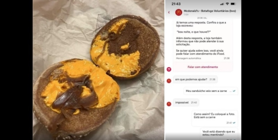 "Fiquei decepcionada e indignada com a resposta que me deram. Além de não mandarem o sanduíche de novo, não deram nem um pedido de desculpas," afirma Letícia.