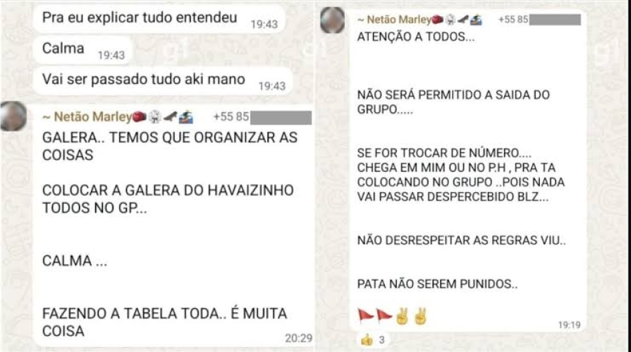 Os criminosos ainda terminam as mensagens com uma bandeira vermelha, em referência ao grupo criminoso que surgiu no Rio de Janeiro. Um dos membros, inclusive, tem número telefônico com DDD 21, da capital carioca.