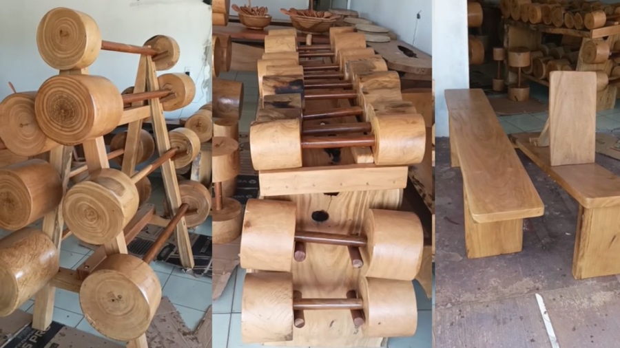 Pesos, halteres, anilhas e outros equipamentos de academia feitos completamente de madeira? Um artesão de Esperantina, no Piauí, encarou um pedido inusitado e resolveu montar os aparelhos com madeira extraída de pequizeiros.