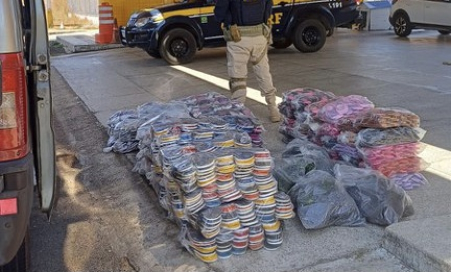 Na inspeção do compartimento de carga, foram encontrados 1.328 pares de calçados (sandálias populares). Questionados sobre a documentação, os ocupantes apresentaram nota fiscal eletrônica e manifesto de carga já utilizados anteriormente, o que descaracterizou a validade do documento.