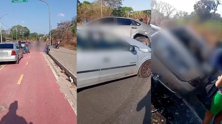 Imagens que circulam nas redes sociais mostram os dois carros empilhados após o impacto.
