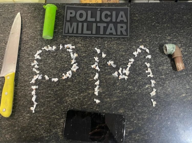 Os policiais realizaram abordagem e busca pessoal, encontrando um tubo contendo cerca de 60 invólucros de substância análoga a crack, configurando o crime de tráfico de drogas. Com ele, foi apreendido ainda um aparelho celular e a faca que portava.