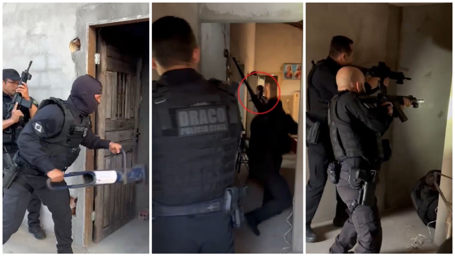 As imagens mostram o delegado Charles Pessoa e outros policiais adentrando uma residência e quase sendo atingidos durante a troca de disparos.