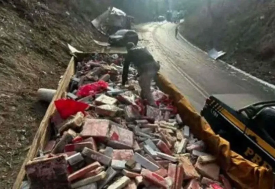 Agentes da Polícia Rodoviária Federal (PRF) passaram a madrugada e a manhã recolhendo tabletes do entorpecente que ficaram esparramados pelo asfalto, em meio às demais cargas.
